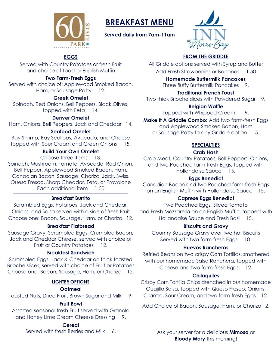 Welcome to 60 State Park Restaurant & Lounge, where culinary excellence meets stunning coastal views in Morro Bay, California. Nestled within a picturesque hotel, this dining gem offers a diverse menu that promises to delight every palate. Highlights include a mouthwatering rib eye steak, praised for its incredible flavor, alongside a delectable crab hash perfect for breakfast lovers.